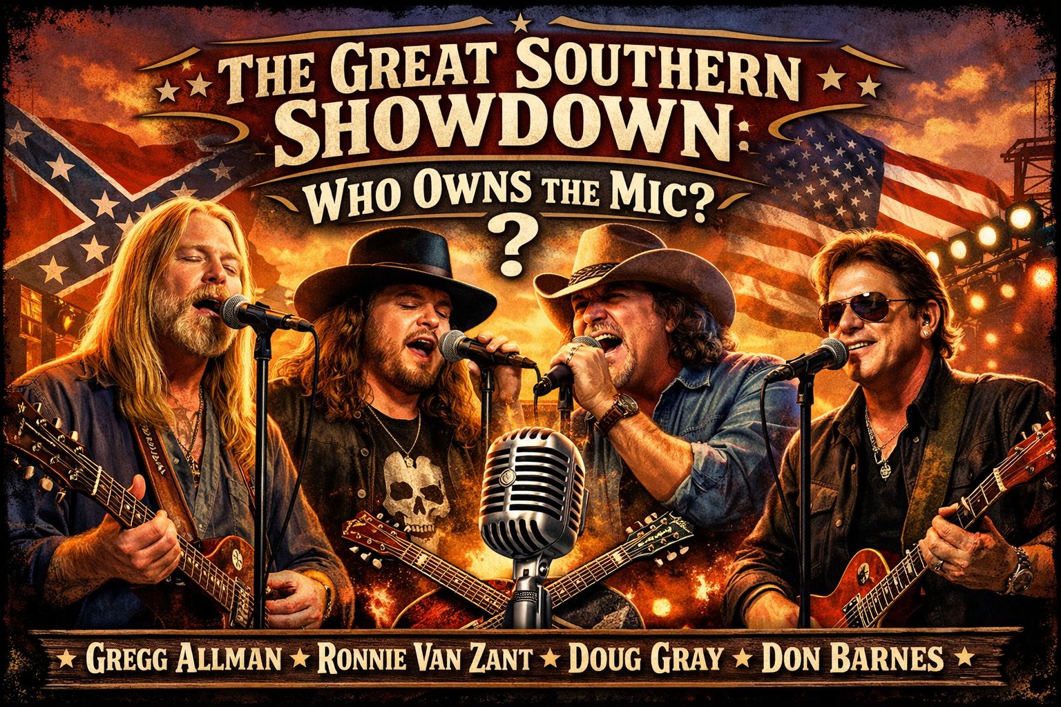 The South didn't just give us a new genre; it gave us a new kind of frontman. These weren't polished "Hollywood" singers. They were guys who sounded like theyβd just finished a shift at the mill and a glass of bourbon. Today, weβre putting four titans in the ring: Gregg Allman, Ronnie Van Zant, Doug Gray, and Don Barnes. Grab a cold one, turn the speakers up, and letβs dive in. β‘